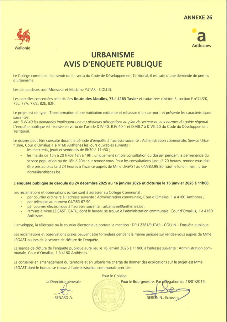Avis d’enquête publique – Permis d’urbanisme – Transformation d’une habitation existante et rehausse d’un car-port – Route des Moulins 73 à 4163 Tavier