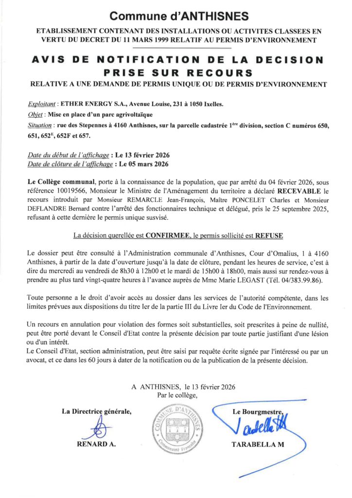Avis de notification de la décision prise sur recours – Demande de permis unique – Mise en place d’un parc agrivoltaïque – Rue des Stepennes à 4160 Anthisnes