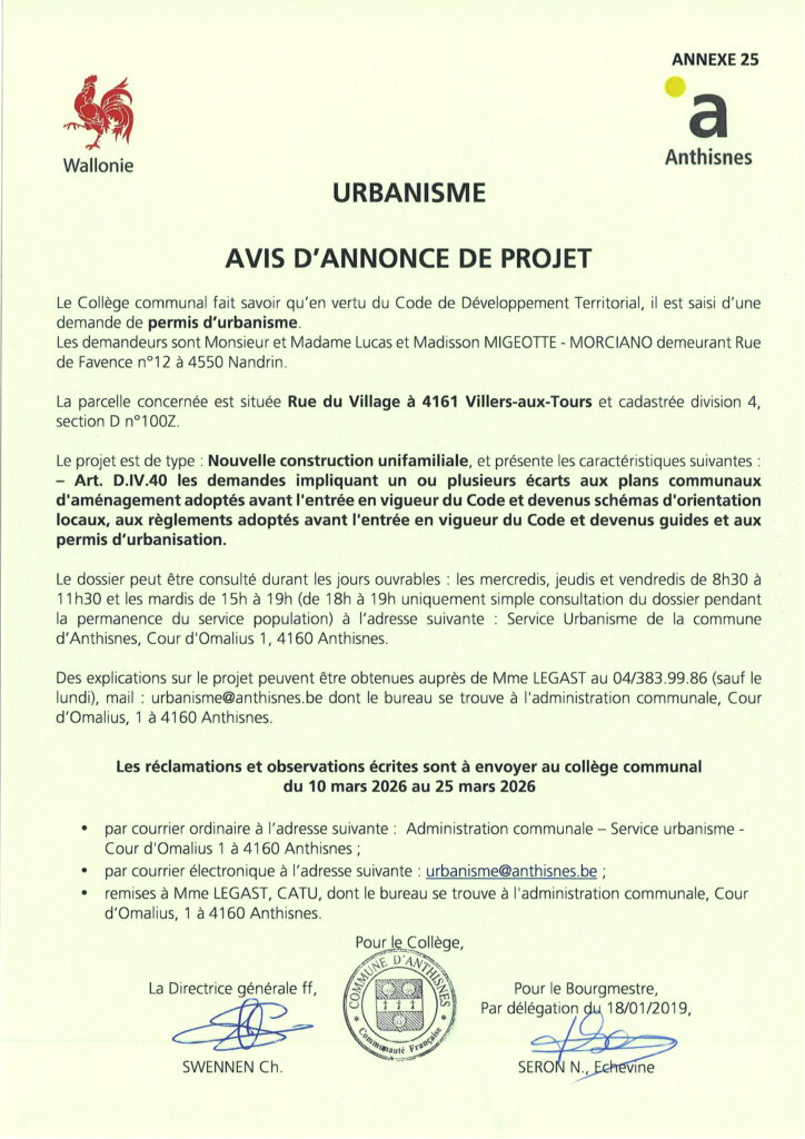 Les réclamations et les observations écrites sont à adresser au Collège Communal, par courrier à l’adresse Cour d’Omalius 1 – 4160 Anthisnes, par téléphone au 04 383 67 90 par mail : urbanisme@anthisnes.be ou remises à Madame Leclair au service urbanisme.