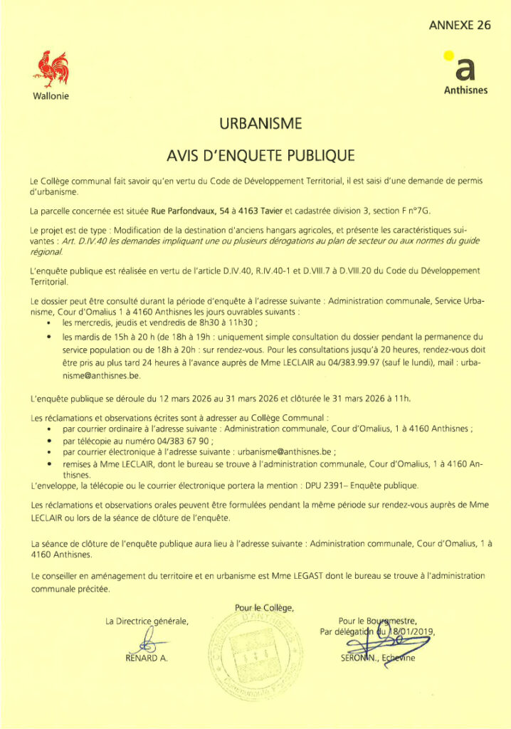 Les réclamations et les observations écrites sont à adresser au Collège Communal, par courrier à l’adresse Cour d’Omalius 1 – 4160 Anthisnes, par téléphone au 04 383 67 90 par mail : urbanisme@anthisnes.be ou remises à Madame Legast au service urbanisme.