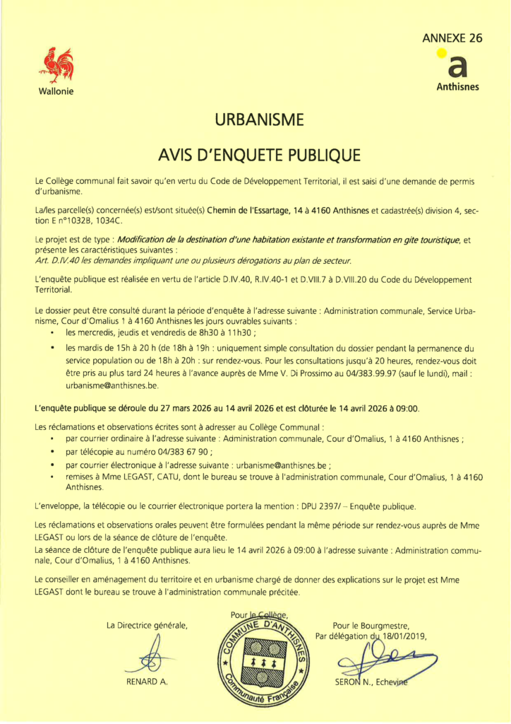 Avis d’enquête publique – Demande de permis d’urbanisme – Chemin de l’Essartage, 14 à 4160 Anthisnes