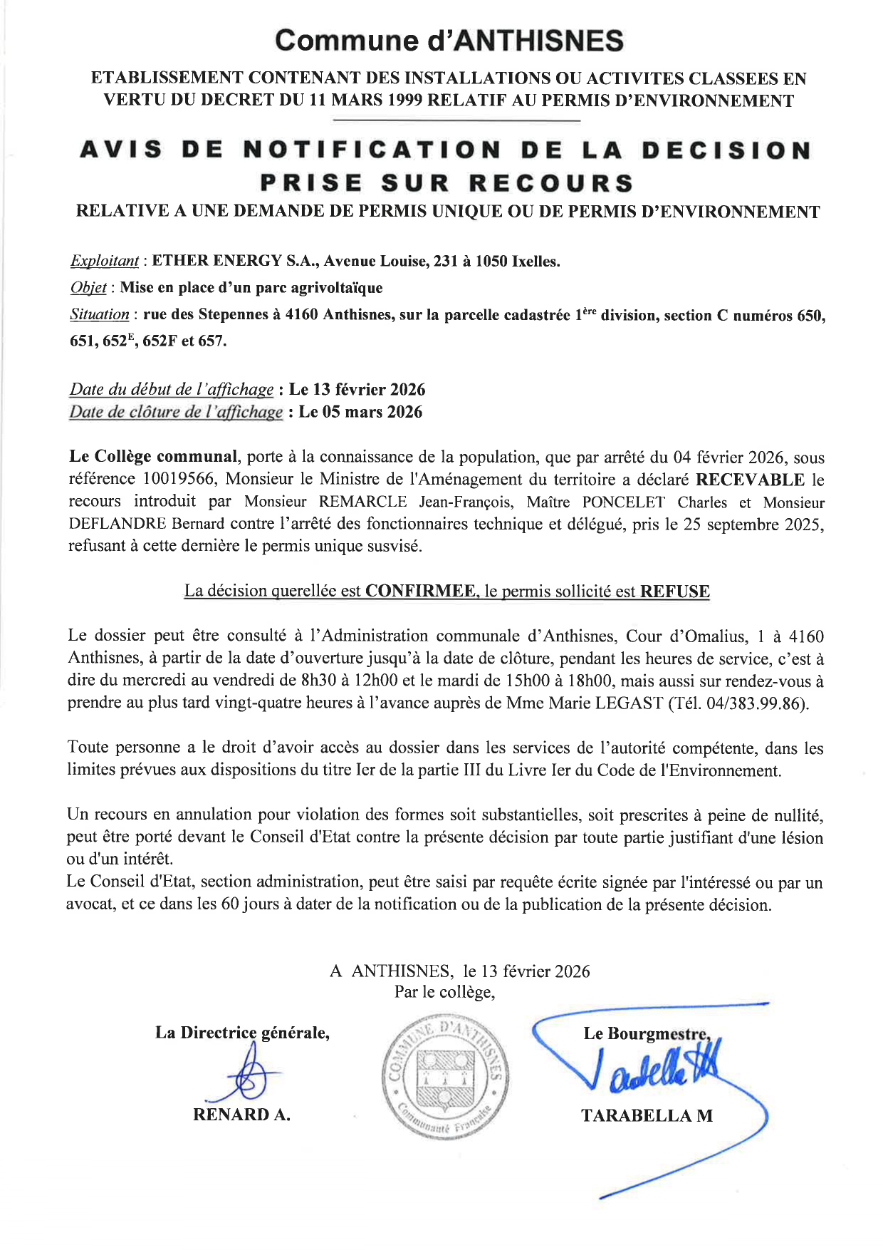 Avis de notification de la décision prise sur recours – Demande de permis unique – Mise en place d’un parc agrivoltaïque – Rue des Stepennes à 4160 Anthisnes