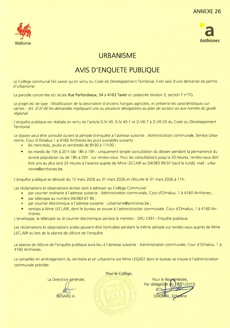 Les réclamations et les observations écrites sont à adresser au Collège Communal, par courrier à l’adresse Cour d’Omalius 1 – 4160 Anthisnes, par téléphone au 04 383 67 90 par mail : urbanisme@anthisnes.be ou remises à Madame Legast au service urbanisme.